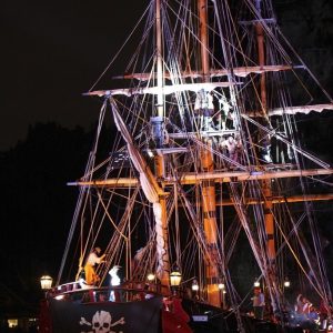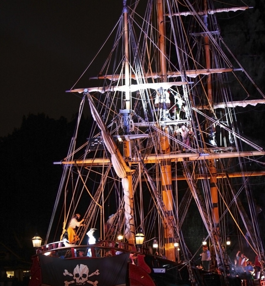 Durante la cena, los Piratas brindarán a los pasajeros un servicio personal y música suave. Mientras el Capitán entretiene a todos con historias de escapadas piratas, otro barco se acercará lentamente desde atrás, envuelto en la oscuridad total, y se colocará al costado del barco. El Capitán descubrirá la presencia del enemigo y gritará a sus hombres que tomen posiciones de batalla, los cañones estarán ya listos para disparar. Los piratas armados con espadas y pistolas saltarán desde los mástiles y aterrizarán en la cubierta donde se llevará a cabo una pelea de espadas entre nuestra tripulación y los otros piratas.